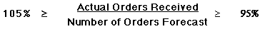 Measurement tolerances and frequency The tolerances and frequencies recommended here represent the range commonly accepted by production and inventory control practitioners. B. PRODUCTION PLAN MEASUREMENT The production plan is the primary input to the MPS; it establishes levels of planned demand, production, and inventory that are the goals of the MPS. Monthly measurement of the MPS against the production plan indicates how well the MPS is supporting management's profitability objectives. 1. OrdersThe sales forecast (or sales plan) sets long-range demand for the production plan. Most forecasts, however, do not materialize as projected. The sales plan should be tracked against the actual units booked for the period projected so that the MPS can be adjusted to reflect changes in the marketplace. Order deviation from plan should be measured for each forecasted product line. Common practice indicates that actual orders received should be plus or minus five percent of the sales forecast, as calculated by the following formula: