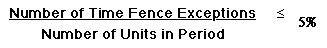 Data on promised delivery dates and lead times as well as actual ship and delivery dates should be regularly maintained to facilitate measurement. A random sample of MPS units should be selected and their delivery and lead time performance tracked. Each unit type should be related to the total number of MPS units to indicate its relative importance to total MPS performance. That is, poor delivery performance for a unit that represents 30 percent of the total is far more significant than is poor delivery performance for a unit that represents 5 percent of the total. The MPS should also be tracked to identify late units; this measurement is used to project delivery performance. One approach is to measure the areas between the time fences or other significant boundaries for lateness. One way of measuring lateness could be in unit-weeks of lateness. If, for example, only three units were two weeks late in an area of the MPS to be measured, that area would have six unit-weeks of lateness. This lateness measure could also be attributed to various causes, such as material shortages, quality rejections, engineering lateness, or capacity overloads. Tracking unit lateness enables managers to determine the relative severity of the problem. The marketing department will have to decide whether delivery dates should be rescheduled. 3. Scheduled changes Another internal measurement of the MPS is the tracking of schedule changes against the time fence policies. Time fences identify manufacturing cycle milestones at which specified MPS changes are permitted. Time fences are tailored to individual situations to allow enough time to perform each task necessary to ship the product. No unit should be scheduled for rescheduled beyond any time fence without recognizing it as a deliberate exception. To maintain a stable MPS, exceptions should be minimized; exception units should represent less than five percent of the total number of units in the time fence, calculated as follows: