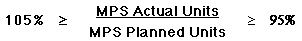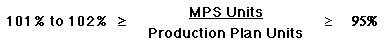4. Production plan units The MPS desegregates production plan goals into key components, models, and options. To determine whether the MPS is performing according to the production plan, the number of units scheduled in an MPS period is compared to the number of units the production plan specifies for that period. An acceptable level of performance is 98 percent or better accuracy, that is, a variation of plus or minus two percent, calculated as follows: